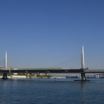 A Ponte do Metrô do Chifre de Ouro estende-se por 936 metros sobre o canal com duas torres de aço alcançando 65 metros de altura.