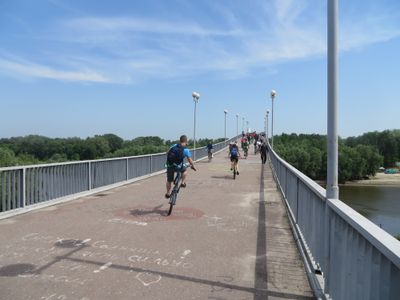 A ponte metálica de pedestres estende-se por 95 metros sobre o rio Desna, com barreiras que impedem o acesso de veículos e mantêm uma passagem de 6 metros.