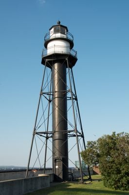A torre de tijolos de 20,5 metros ergue-se na extremidade do quebra-mar sul, orientando navios do Lago Superior para o canal.