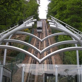 O funicular conecta o centro inferior com as instalacoes de bem-estar localizadas mais acima na colina. Faz parte da forma como os visitantes se movem entre diferentes areas do balneario.