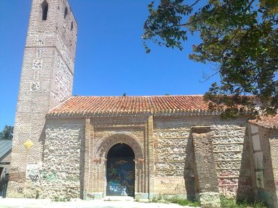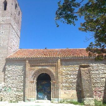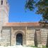 A Ermida de Santa María la Antigua apresenta paredes exteriores brancas, arcos arredondados e uma construção sólida em pedra de estilo medieval.
