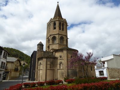 A Igreja de Santa María la Real em Sangüesa é uma estrutura romântica com três naves interiores e uma torre octogonal. O edifício apresenta intrincadas esculturas em pedra, particularmente ao redor do portal principal.