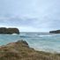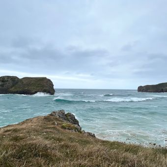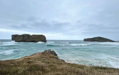 A praia de 750 metros de extensão apresenta areia branca, afloramentos rochosos e dois ilhotes característicos no Mar Cantábrico.