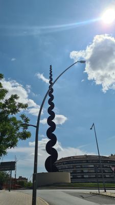 A escultura incorpora o estilo característico de Andreu Alfaro, utilizando aço e alumínio para criar formas abstratas que interagem com a luz.
