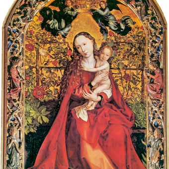 A Virgem e o Menino com pérgula de roseiras, Pintura religiosa do século XV no Convento Dominicano, Colmar, França.