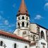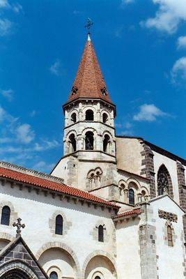 A igreja colegiada combina uma nave românica em pedra arkose, uma torre sineira octogonal e um coro gótico em pedra vulcânica cinza.