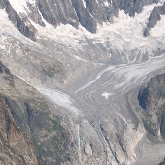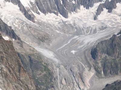 A Geleira de Talèfre estende-se pelo maciço do Monte Branco, alcançando uma altitude de 2.300 metros no vale do Arve.