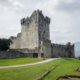 Ross Castle é uma fortaleza na margem do Lough Leane, construída com uma torre quadrada massiva e muros defensivos espessos projetados para proteção militar. A estrutura exibe a arquitetura típica dos castelos irlandeses da época, com cômodos e passagens ainda visíveis em seu interior.