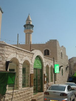 A Mesquita Branca é um edifício religioso em estilo otomano localizado no antigo mercado de Nazareth. A construção apresenta um minarete esbelto, paredes em tom creme com detalhes verdes e uma cúpula verde proeminente.