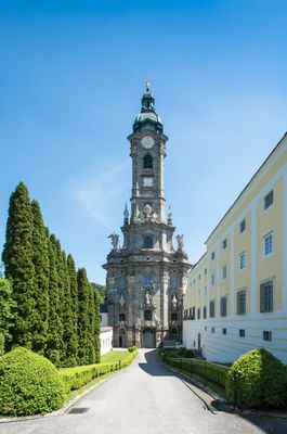 O arquiteto Matthias Steinl projetou a fachada ocidental barroca com sua torre proeminente, afastando-se deliberadamente da tradicional sobriedade cisterciense. Este surpreendente elemento barroco faz a igreja se destacar entre os edifícios monásticos austriacos e mostra como o gosto em arquitetura mudou ao longo do tempo.
