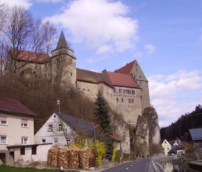 Burg Wiesentfels e uma fortaleza medieval em Hollfeld que se ergue sobre um penhasco rochoso dominando o vale de Wiesenttal. A estrutura apresenta elementos tipicos de fortificacao com muros de defesa e caracteristicas arquitetonicas de diferentes periodos.