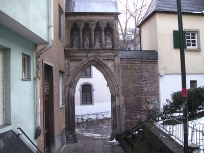 O Dreikönigenpförtchen é um portão medieval no centro histórico com muros de tijolos, detalhes esculpidos e características da arquitetura defensiva de Colônia. A estrutura exibe alvenaria hábil com elementos decorativos integrados à passagem.
