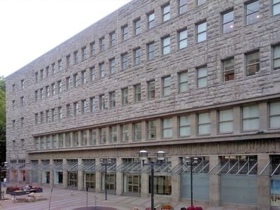 O edifício de escritórios de 1925 apresenta uma fachada monumental em calcário conchífero bruto e elementos arquitetônicos tradicionais em vários andares.