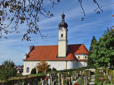 A Igreja de Sao Nicolas fica no centro da cidade na Kirchplatz e exibe tradiçoes de construcao bávaras com uma fachada distintiva e formas de telhado tipicas. A estrutura molda o espaço publico atraves de sua localizacão e e complementada por recursos historicos como um muro de cemiterio e um memorial.