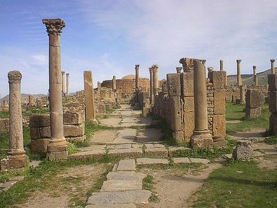 Djemila é um sítio arqueológico romano na província de Sétif que se estende por terreno montanhoso a cerca de 900 metros de elevação. O local preserva ruas romanas intactas, edifícios e espaços públicos que mostram o traçado de uma cidade antiga.