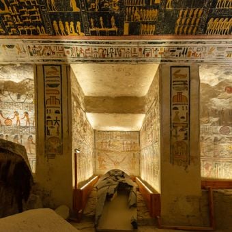 KV9 é um túmulo real no Vale dos Reis que se estende por 116 metros sob a terra através de corredores e câmaras conectadas. As paredes estão cobertas com inscrições hieroglíficas que retratam mapas celestes e textos religiosos.