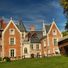 O castelo de tijolos rosa e pedra branca apresenta arquitetura gótica com uma torre central, rodeado por jardins renascentistas e espaços expositivos.