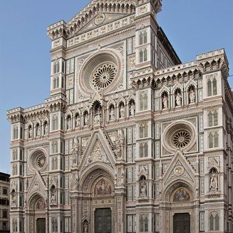 A fachada ocidental da catedral Santa Maria del Fiore apresenta padrões geométricos feitos de painéis de mármore verde, rosa e branco que estruturam três níveis de aberturas. Os elementos de pedra cuidadosamente trabalhados preenchem toda a largura da estrutura voltada para a Piazza del Duomo.