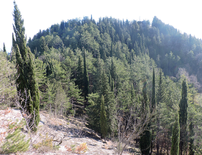 O Monte di Rontana alcança uma elevação de 482 metros entre o vale da torrente Sintria e o vale do rio Lamone no norte da Itália.