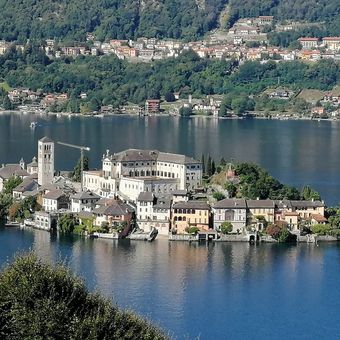 A Isola San Giulio é uma pequena ilha no meio do Lago de Orta, apresentando uma basílica e edifícios de pedra de diferentes épocas. As estruturas estão dispostas de forma compacta com ruelas estreitas que se estendem até à margem da água.