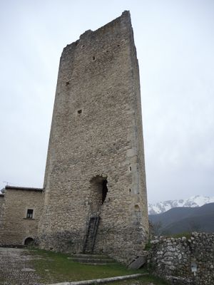 A torre pentagonal ergue-se 22 metros sobre um esporão rochoso, oferecendo vistas do vale do rio Aterno e da cadeia montanhosa Sirente.