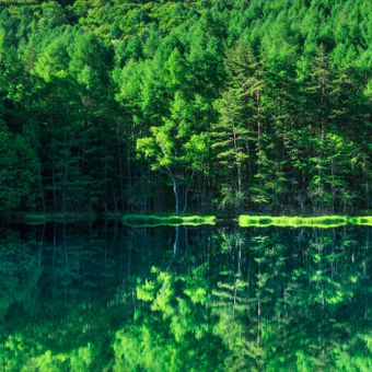 O Mishaka é um reservatório de água artificial situado nas montanhas de Nagano a cerca de 1500 metros de altitude. A superfície da água reflete as árvores circundantes e é cercada por floresta.