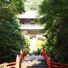 O complexo do templo localiza-se ao longo de um riacho montanhoso com uma ponte vermelha que leva ao portão principal e degraus de pedra.