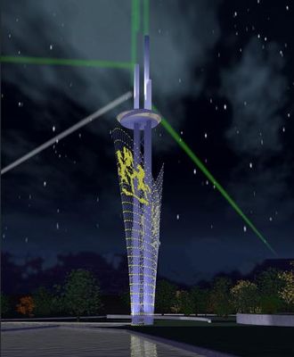 A Torre do Milênio apresenta três pilares cilíndricos de concreto de diferentes alturas conectados por uma seção em forma de disco a 110 metros.