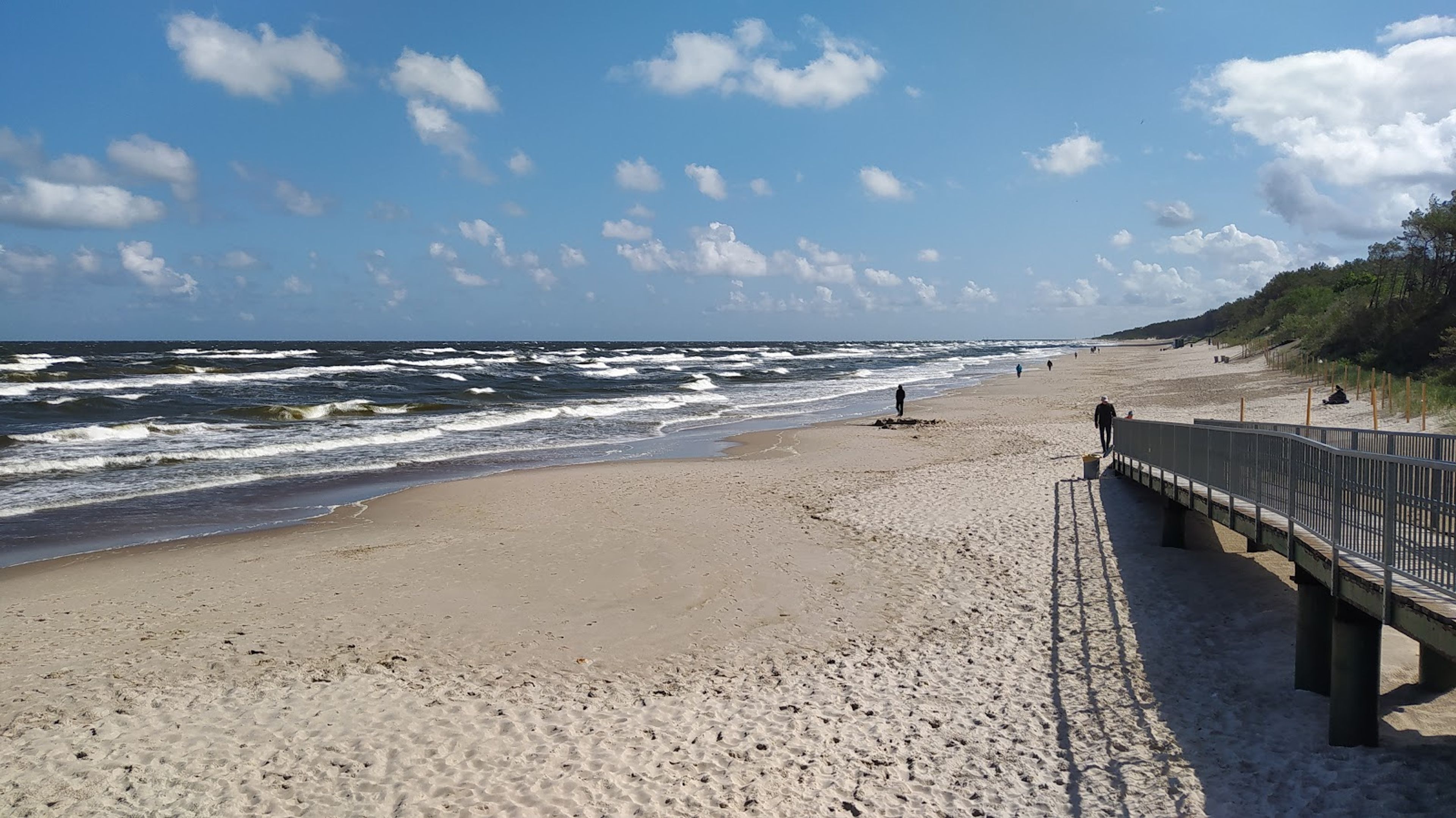 A praia apresenta uma extensa faixa de areia fina margeada por dunas naturais e florestas de pinheiros ao longo da costa do Mar Báltico.