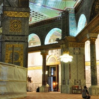 A rocha sagrada interior tem importância para três religiões, marcando o local do sacrifício de Abraão e o ponto de ascensão de Maomé.