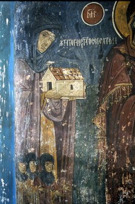 Os murais originais do século XV mostram retratos das irmãs fundadoras, com Ksenija apresentando uma maquete da igreja.