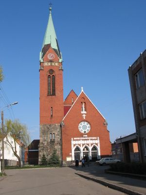 A Igreja de Rosenau é uma estrutura neogótica construída em tijolos vermelhos, caracterizada por arcos apontados, abóbadas nervuradas e contrafortes que sustentam suas paredes. Uma agulha alta domina o horizonte acima do Distrito Moskovsky.