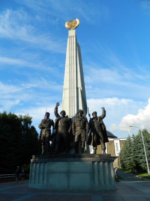 O Monumento aos Aliados da Segunda Guerra Mundial combina pedra, bronze e granito em uma estrutura projetada pelo arquiteto Aleksandr Kuzmin.