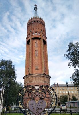 A torre de água, construída em 1953, representa um período de desenvolvimento industrial em Inta durante a reconstrução pós-guerra da União Soviética.