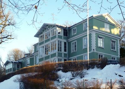 Villa Fjeldstuen ergue-se na encosta norte de Skansenberget, com varandas de grandes janelas que se debruçam sobre as águas de Djurgårdsbrunnsviken.