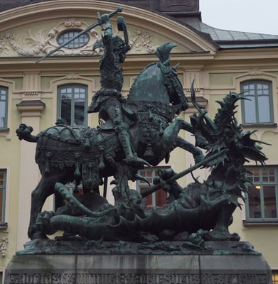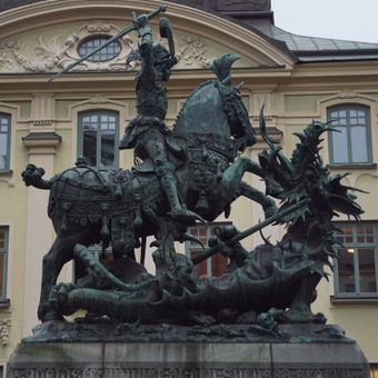Alfred Ohlson criou esta réplica em bronze em 1912, reproduzindo a escultura medieval em madeira de 1490 localizada na catedral Storkyrkan de Estocolmo.