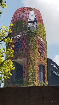 O edifício possui 13 elevadores que atendem seus espaços de uso misto, incluindo quartos de hotel e escritórios com sistemas de ventilação natural.
