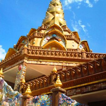 Wat Phra That Pha Son Kaeo é um templo budista em Khao Kho, província de Phetchabun, situado numa crista arborizada e decorado com estátuas de mosaico de vidro colorido. Os visitantes percorrem pátios abertos onde cinco figuras monumentais de Buda se erguem em filas, enquanto várias salas de oração e santuários menores se distribuem pelo recinto.