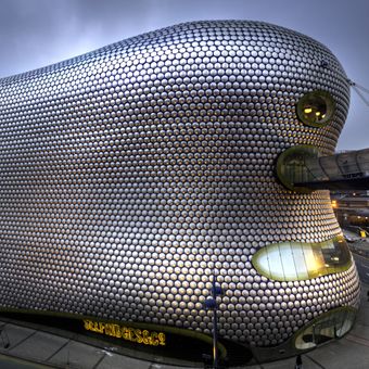 O Bull Ring é um centro comercial de vários níveis em Birmingham que se estende por dois edifícios principais com passagens cobertas. A fachada metálica de um dos edifícios e o design aberto das praças moldam a sua aparência no centro da cidade.