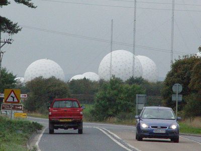 Esta estação faz parte da rede ECHELON que intercepta comunicações do espaço, e seus 33 domos criam um contraste estranho entre a paisagem rural tranquila e o trabalho de inteligência de alta tecnologia que acontece logo fora da vista pública.