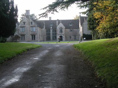 Chavenage House é uma casa de campo construída em pedra local com múltiplas alas conectadas e janelas altas. O edifício principal apresenta um projeto característico do século XVI com um telhado de ardósia íngreme e uma capela familiar no terreno.