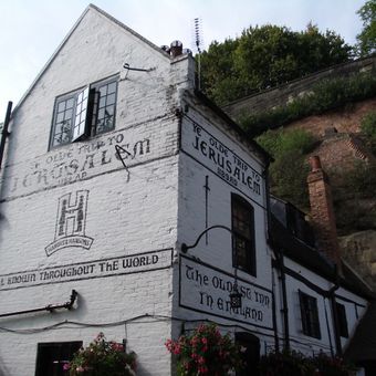 Ye Olde Trip To Jerusalem é uma taberna protegida construída dentro da rocha arenita abaixo do castelo de Nottingham. As salas ficam em parte dentro de grutas talhadas e em parte em edifícios de alvenaria encostados à parede rochosa, com tetos baixos e passagens irregulares.
