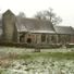 A igreja de pedra apresenta uma torre normanda redonda com telhado cônico, localizada isoladamente junto a prados e uma fazenda.