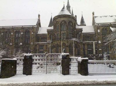 Os pilares exibem um leão e um unicórnio, com os anos 1451 e 1951 gravados, junto ao lema universitário Via, Veritas, Vita.