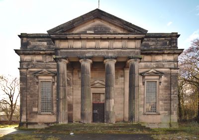 A Igreja de São João apresenta um pórtico dórico com quatro colunas caneladas que sustentam um entablamento e contém janelas com frontões decorativos.