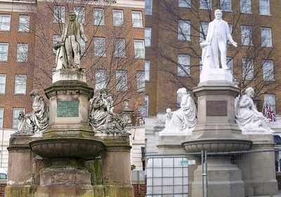 A estátua incorpora as palavras Caridade, Temperança e Paz ao redor da coroa do pedestal, com uma placa de bronze detalhando as conquistas de Sturge.
