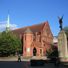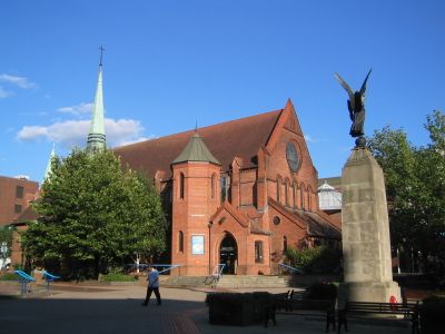 Christ Church ocupa uma posição central em Woking, apresentando construção em tijolos vermelhos, janelas grandes e um padrão distintivo de telhado serrilhado.