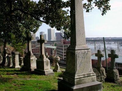 Uma pirâmide de granito de 90 pés ergue-se no terreno como Monumento aos Mortos Confederados, construída em 1869.