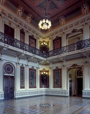 A Sala do Tratado Indígena apresenta painéis de mármore italiano e francês, piso de azulejos Minton inglês e grades de ferro fundido.
