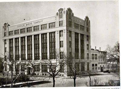 Schulze Baking Company Plant é uma fábrica de cinco andares com paredes de terracota branca e grandes janelas dispostas para destacar elementos decorativos em toda a estrutura. A construção demonstra cuidadoso equilíbrio entre design funcional e ornamentação visível.